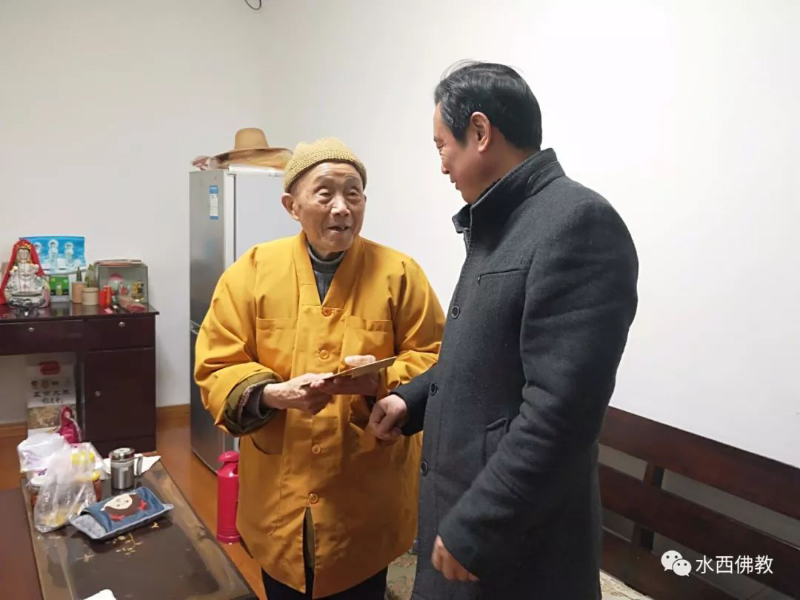 赵毅强部长分别看望慰问了宝胜禅寺87岁高僧释自德法师、泾县佛教协会会长释宗行法师等,为他们送去慰问金和新春的祝福。
