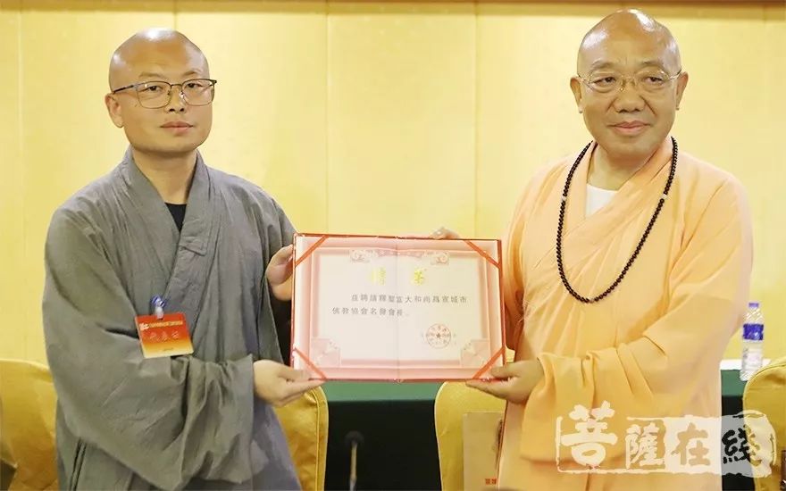 宣城市佛教协会新当选会长宗行法师为第二届佛教协会会长圣富大和尚颁发“荣誉会长”聘书。宗行法师表示,作为佛门子弟,责任重大,今后将团结带领宣城市佛教界,在市委统战部的领导下,在广大法师的帮助下,不辱使命,为推动宣城优秀佛教文化继往开来。与此同时,坚持爱国爱教,努力践行“人间佛教思想”,加强佛教自身建设,把佛教精神融入到新时代的使命中。