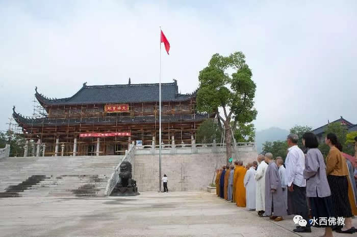 会前,在广教寺大雄宝殿广场举行了庄严的“升国旗、奏唱国歌”活动,全体与会人员集中列队,双目凝视,五星红旗在国歌声中冉冉升起。