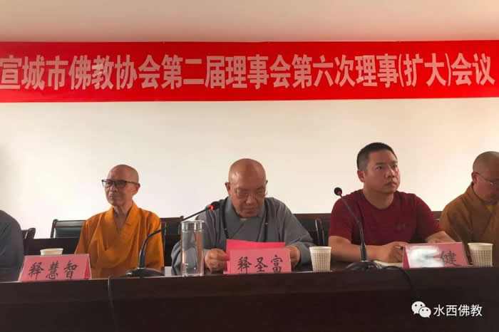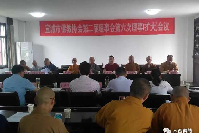 2018年9月14日上午,宣城市佛教协会第二届六次理事扩大会议在广教寺召开。市佛协会长圣富法师,副会长照西法师、妙幢法师、宗行法师、传弘法师、宽见法师、果通法师、辉振法师,市佛协常务理事、理事及全市佛教活动场所负责人参加会议,各县、市、区民宗局局长列席会议。市宗教局宗教科黄健科长莅临会议指导。会议由副会长宗行法师主持。