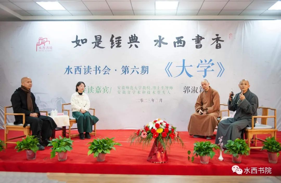 2023年3月12日下午,水西书院举行第六期“如是经典,水西书香”读书会。本期读书会以《大学》为主要内容,延请安徽师范大学教授、博士生导师郭淑新女士为导读嘉宾,邀请宣城双塘净业寺住持常谛法师,五明书院李贞华老师等参与现场答疑。泾县县委统战部副部长、民宗局局长陈学新先生应邀参加指导,水西书院院长宗行法师全程参与。读书会由水西书院副院长亲航法师主持。
