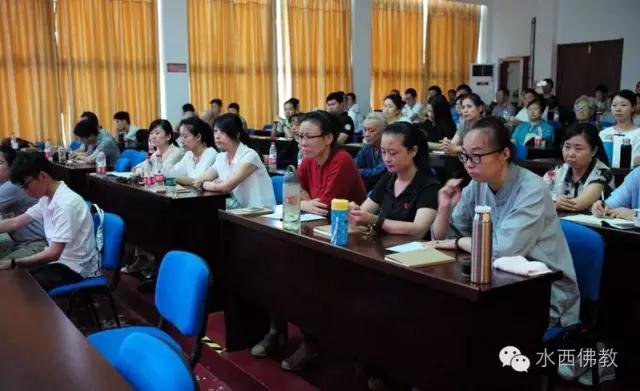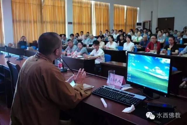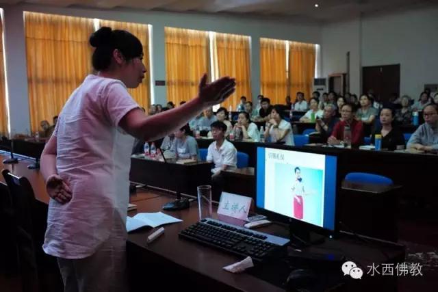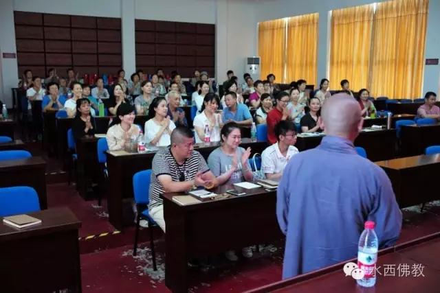 因此次水西佛教文化论坛的与会嘉宾除了来自各高校和研究机构的学者,也有很多佛教界的高僧大德,为了能够如理如法的给予温馨的服务,也请来了宣城市佛教协会副会长、宣城小九华住持辉振法师为广大义工学员们讲解了相关佛教仪轨以及佛教徒如何更好的做一名合格的义工,辉振法师诙谐幽默的语言和细致入微的表述不时赢得阵阵掌声和会心一笑。
