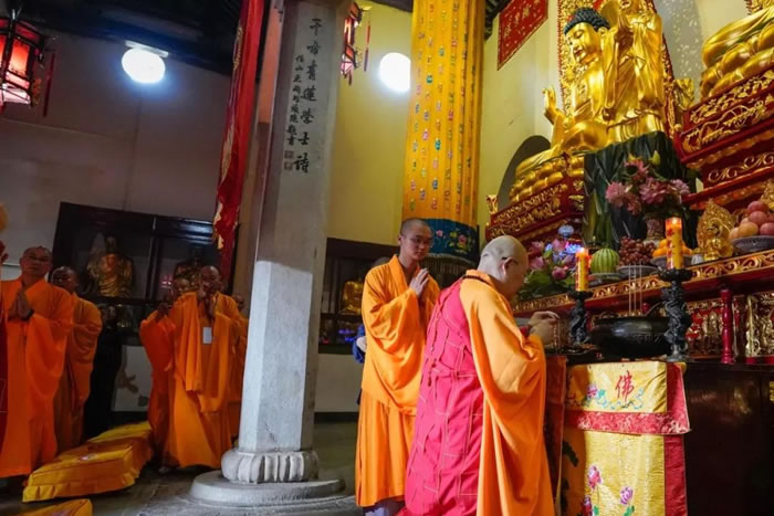 10时,宗行法师带领四众弟子至诚迎请圣辉法师、圣富法师、智文法师、宽容法师、天通法师、西来法师、宝藏法师于宝胜禅寺大雄宝殿举行祈福法会。主法法师拈香礼拜。