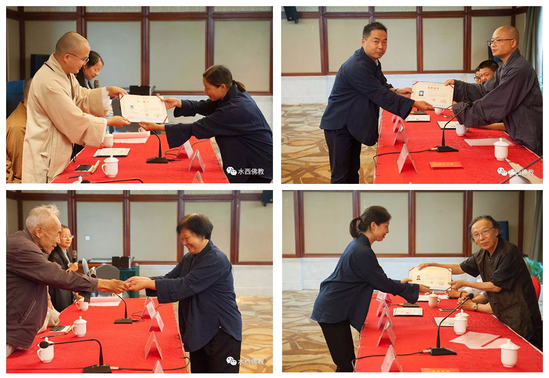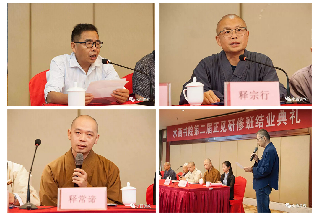 下午两点半,结业典礼于庄严的国歌声中拉开序幕。沈力先生、辉振法师、常谛法师先后致辞,从办学动因、教学管理和师资水平等方面对水西书院弘扬佛法、传播文化的积极举措予以认可,表达了对于书院未来办学和学员精进向学的殷切期盼。宗行院长不仅从招生、管理、考核等角度回顾了书院办学的相关情况,还就学员日后在探求佛法、助益社会等方面的继续进步提出要求。优秀学员代表刘忠在发言中表达了学员对于党和政府、寺院、书院及众多护法居士的诚挚感谢。在感恩、希冀的氛围中,结业典礼在悲悯、祥和的《三宝歌》中落幕。